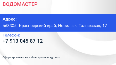 ВОДОМАСТЕР по адресу 663305, Красноярский край, Норильск, Талнахская, 17 в дальнейшем Организация, размещена в следующих категориях: