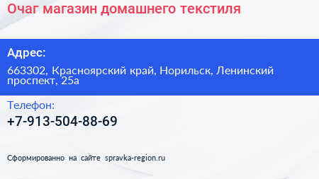 Очаг, магазин домашнего текстиля по адресу 663302, Красноярский край, Норильск, Ленинский проспект, 25а в дальнейшем Организация, размещена в следующих категориях: