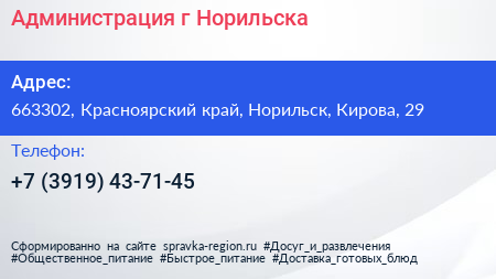 Администрация г. Норильска по адресу 663302, Красноярский край, Норильск, Кирова, 29 в дальнейшем Организация, размещена в следующих категориях:
