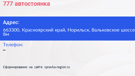 777, автостоянка по адресу 663300, Красноярский край, Норильск, Вальковское шоссе, 8м в дальнейшем Организация, размещена в следующих категориях: