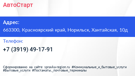 АвтоСтарт по адресу 663300, Красноярский край, Норильск, Хантайская, 10д в дальнейшем Организация, размещена в следующих категориях: