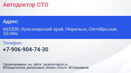 Автодоктор, СТО по адресу 663300, Красноярский край, Норильск, Октябрьская, 32/68а в дальнейшем Организация, размещена в следующих категориях: