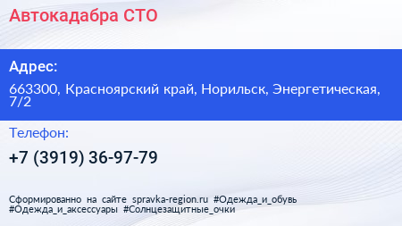 Автокадабра, СТО по адресу 663300, Красноярский край, Норильск, Энергетическая, 7/2 в дальнейшем Организация, размещена в следующих категориях: