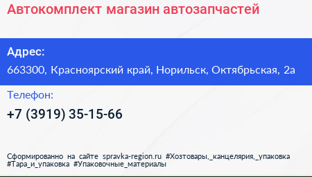 Автокомплект, магазин автозапчастей по адресу 663300, Красноярский край, Норильск, Октябрьская, 2а в дальнейшем Организация, размещена в следующих категориях: