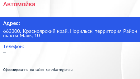 Автомойка по адресу 663300, Красноярский край, Норильск, территория Район шахты Маяк, 10 в дальнейшем Организация, размещена в следующих категориях: