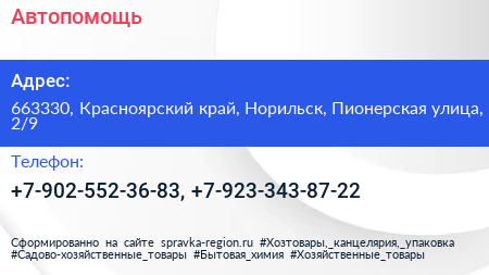 Автопомощь по адресу 663330, Красноярский край, Норильск, Пионерская улица, 2/9 в дальнейшем Организация, размещена в следующих категориях:
