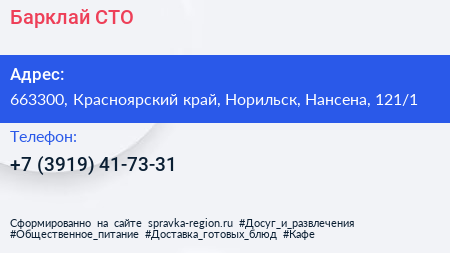 Барклай, СТО по адресу 663300, Красноярский край, Норильск, Нансена, 121/1 в дальнейшем Организация, размещена в следующих категориях: