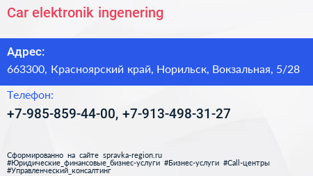 Car elektronik ingenering по адресу 663300, Красноярский край, Норильск, Вокзальная, 5/28 в дальнейшем Организация, размещена в следующих категориях: