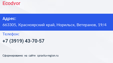 Ecodvor по адресу 663305, Красноярский край, Норильск, Ветеранов, 19/4 в дальнейшем Организация, размещена в следующих категориях: