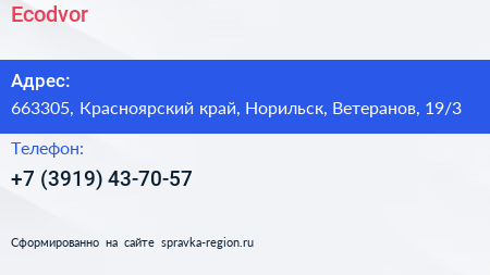 Ecodvor по адресу 663305, Красноярский край, Норильск, Ветеранов, 19/3 в дальнейшем Организация, размещена в следующих категориях: