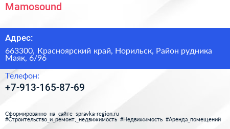 Mamosound по адресу 663300, Красноярский край, Норильск, Район рудника Маяк, 6/96 в дальнейшем Организация, размещена в следующих категориях: