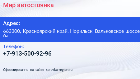 Мир, автостоянка по адресу 663300, Красноярский край, Норильск, Вальковское шоссе, 6а в дальнейшем Организация, размещена в следующих категориях: