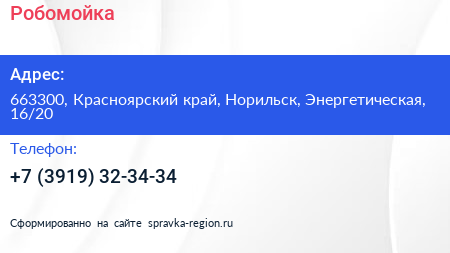 Робомойка по адресу 663300, Красноярский край, Норильск, Энергетическая, 16/20 в дальнейшем Организация, размещена в следующих категориях:
