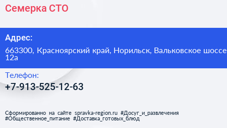 Семерка, СТО по адресу 663300, Красноярский край, Норильск, Вальковское шоссе, 12а в дальнейшем Организация, размещена в следующих категориях: