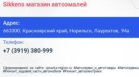 Sikkens, магазин автоэмалей по адресу 663300, Красноярский край, Норильск, Лауреатов, 94а в дальнейшем Организация, размещена в следующих категориях: