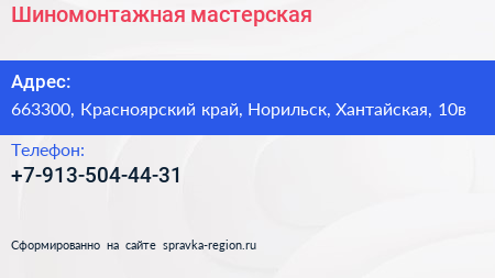 Шиномонтажная мастерская по адресу 663300, Красноярский край, Норильск, Хантайская, 10в в дальнейшем Организация, размещена в следующих категориях: