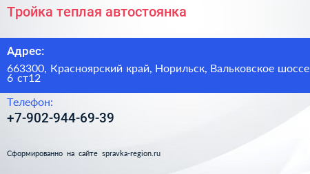 Тройка, теплая автостоянка по адресу 663300, Красноярский край, Норильск, Вальковское шоссе, 6 ст12 в дальнейшем Организация, размещена в следующих категориях: