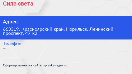 Сила света по адресу 663319, Красноярский край, Норильск, Ленинский проспект, 47 к2 в дальнейшем Организация, размещена в следующих категориях:
