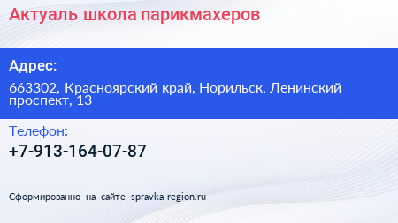 Актуаль, школа парикмахеров по адресу 663302, Красноярский край, Норильск, Ленинский проспект, 13 в дальнейшем Организация, размещена в следующих категориях:
