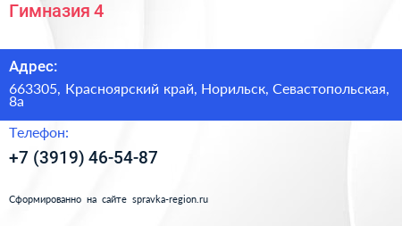 Гимназия №4 по адресу 663305, Красноярский край, Норильск, Севастопольская, 8а в дальнейшем Организация, размещена в следующих категориях: