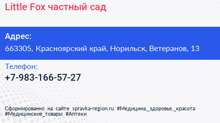 Little Fox, частный сад по адресу 663305, Красноярский край, Норильск, Ветеранов, 13 в дальнейшем Организация, размещена в следующих категориях: