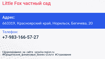 Little Fox, частный сад по адресу 663319, Красноярский край, Норильск, Бегичева, 20 в дальнейшем Организация, размещена в следующих категориях: