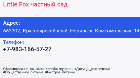 Little Fox, частный сад по адресу 663302, Красноярский край, Норильск, Комсомольская, 14 в дальнейшем Организация, размещена в следующих категориях: