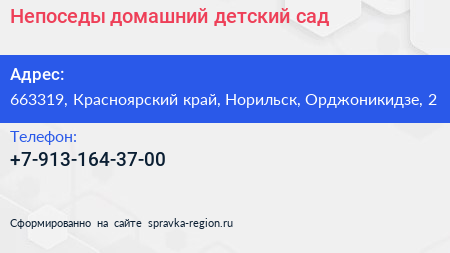 Непоседы, домашний детский сад по адресу 663319, Красноярский край, Норильск, Орджоникидзе, 2 в дальнейшем Организация, размещена в следующих категориях: