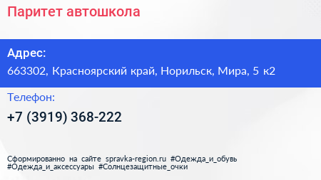 Паритет, автошкола по адресу 663302, Красноярский край, Норильск, Мира, 5 к2 в дальнейшем Организация, размещена в следующих категориях: