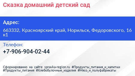 Сказка, домашний детский сад по адресу 663332, Красноярский край, Норильск, Федоровского, 16 к1 в дальнейшем Организация, размещена в следующих категориях: