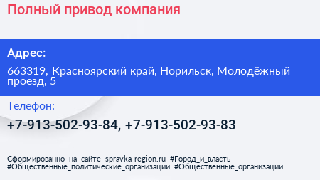 Полный привод, компания по адресу 663319, Красноярский край, Норильск, Молодёжный проезд, 5 в дальнейшем Организация, размещена в следующих категориях: