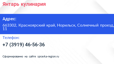 Янтарь, кулинария по адресу 663302, Красноярский край, Норильск, Солнечный проезд, 11 в дальнейшем Организация, размещена в следующих категориях: