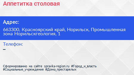 Аппетитка, столовая по адресу 663300, Красноярский край, Норильск, Промышленная зона Норильскгеология, 1 в дальнейшем Организация, размещена в следующих категориях: