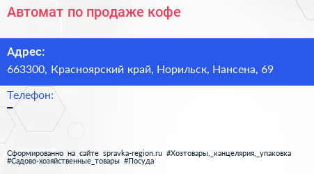 Автомат по продаже кофе по адресу 663300, Красноярский край, Норильск, Нансена, 69 в дальнейшем Организация, размещена в следующих категориях:
