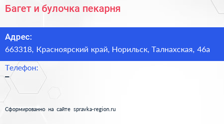 Багет и булочка, пекарня по адресу 663318, Красноярский край, Норильск, Талнахская, 46а в дальнейшем Организация, размещена в следующих категориях: