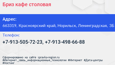 Бриз, кафе-столовая по адресу 663319, Красноярский край, Норильск, Ленинградская, 3Б в дальнейшем Организация, размещена в следующих категориях: