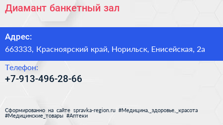 Диамант, банкетный зал по адресу 663333, Красноярский край, Норильск, Енисейская, 2а в дальнейшем Организация, размещена в следующих категориях: