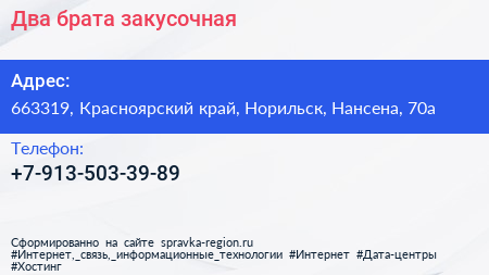Два брата, закусочная по адресу 663319, Красноярский край, Норильск, Нансена, 70а в дальнейшем Организация, размещена в следующих категориях:
