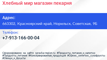 Хлебный мир, магазин-пекарня по адресу 663302, Красноярский край, Норильск, Советская, 9Б в дальнейшем Организация, размещена в следующих категориях:
