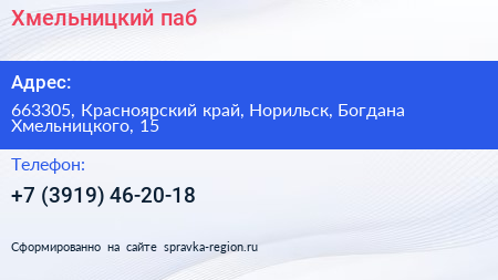 Хмельницкий, паб по адресу 663305, Красноярский край, Норильск, Богдана Хмельницкого, 15 в дальнейшем Организация, размещена в следующих категориях:
