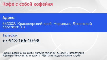 Кофе с собой, кофейня по адресу 663302, Красноярский край, Норильск, Ленинский проспект, 13 в дальнейшем Организация, размещена в следующих категориях: