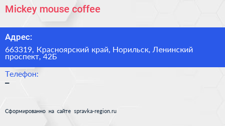 Mickey mouse coffee по адресу 663319, Красноярский край, Норильск, Ленинский проспект, 42Б в дальнейшем Организация, размещена в следующих категориях: