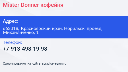 Mister Donner, кофейня по адресу 663318, Красноярский край, Норильск, проезд Михайличенко, 1 в дальнейшем Организация, размещена в следующих категориях: