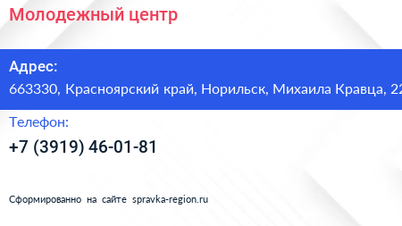 Молодежный центр по адресу 663330, Красноярский край, Норильск, Михаила Кравца, 22 в дальнейшем Организация, размещена в следующих категориях: