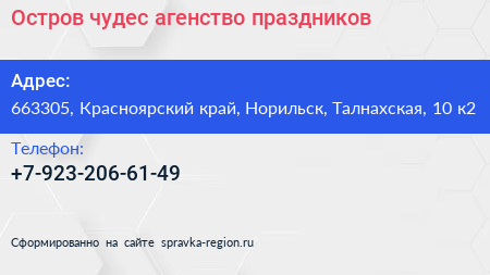 Остров чудес, агенство праздников по адресу 663305, Красноярский край, Норильск, Талнахская, 10 к2 в дальнейшем Организация, размещена в следующих категориях: