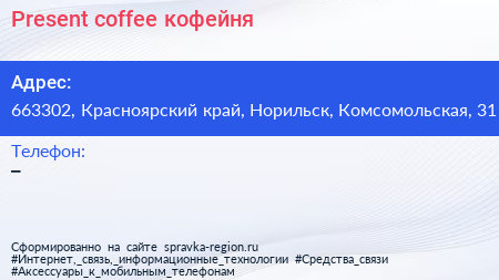 Present coffee, кофейня по адресу 663302, Красноярский край, Норильск, Комсомольская, 31 в дальнейшем Организация, размещена в следующих категориях: