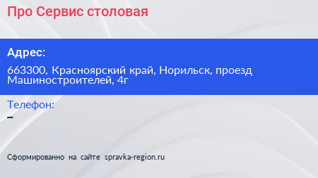 Про Сервис, столовая по адресу 663300, Красноярский край, Норильск, проезд Машиностроителей, 4г в дальнейшем Организация, размещена в следующих категориях: