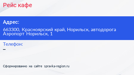 Рейс, кафе по адресу 663300, Красноярский край, Норильск, автодорога Аэропорт Норильск, 1 в дальнейшем Организация, размещена в следующих категориях: