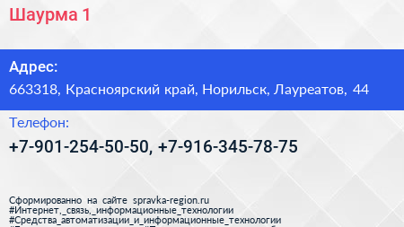 Шаурма №1 по адресу 663318, Красноярский край, Норильск, Лауреатов, 44 в дальнейшем Организация, размещена в следующих категориях: