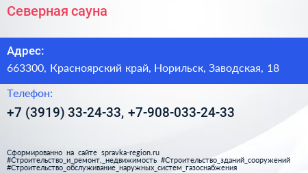 Северная, сауна по адресу 663300, Красноярский край, Норильск, Заводская, 18 в дальнейшем Организация, размещена в следующих категориях: